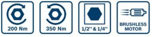- Κινητήρας χωρίς ψήκτρες με 200 Nm ροπή σύσφιγξης και 350 Nm ροπή χαλάρωσης για εξαιρετικό χρόνο λειτουργίας της μπαταρίας και μεγάλη διάρκεια ζωής του εργαλείου