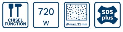 - Ισχυρός κινητήρας 720 W και ενέργεια κρούσης 2,0 J για αποτελεσματικό τρύπημα με κρούση σε μπετόν (μέχρι και 21 mm διάμετρο)