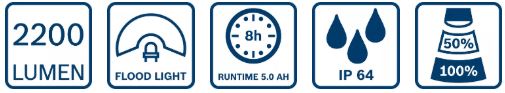 Το GLI 18V-2200 C Professional είναι ο πολύπλευρος και στιβαρός προβολέας της Bosch στην κατηγορία των 18 V. Η ισχυρή φωτοδίοδος (LED) είναι ικανή να προσφέρει έως και 2.200 λούμεν για εξαιρετικές συνθήκες φωτισμού. Είναι υδατοστεγανός και κονιοστεγανός χάρη σε ένα στιβαρό κάλυμμα μπαταρίας με βαθμό προστασίας IP 64. Ο προβολέας μπορεί άνετα να ελεγχθεί, χρησιμοποιώντας ένα smartphone, επιτρέποντας γρήγορες και εύκολες απομακρυσμένες ρυθμίσεις φωτισμού. Έχει δύο ρυθμίσεις φωτεινότητας, πέντε ευέλικτες γωνίες ρύθμισης, και ένα σπείρωμα τρίποδα 5/8″, επιτρέποντας τη γρήγορη προσαρμογή σε οποιαδήποτε κατάσταση εργασίας. Αυτός ο προβολέας είναι εξαιρετικός για φωτισμό ολόκληρης της περιοχής εργασίας για μια πλήρη εργάσιμη ημέρα. Συμβατότητα με όλες τις μπαταρίες 18 V Bosch Professional* (Professional 18V System). * Το κάλυμμα της μπαταρίας δεν κλείνει πλήρως, όταν χρησιμοποιείτε η μπαταρία ProCORE18V 12.0Ah. Επίσης συμβατό με την AMPShare, τη συμμαχία μπαταριών πολλαπλών μαρκών.
